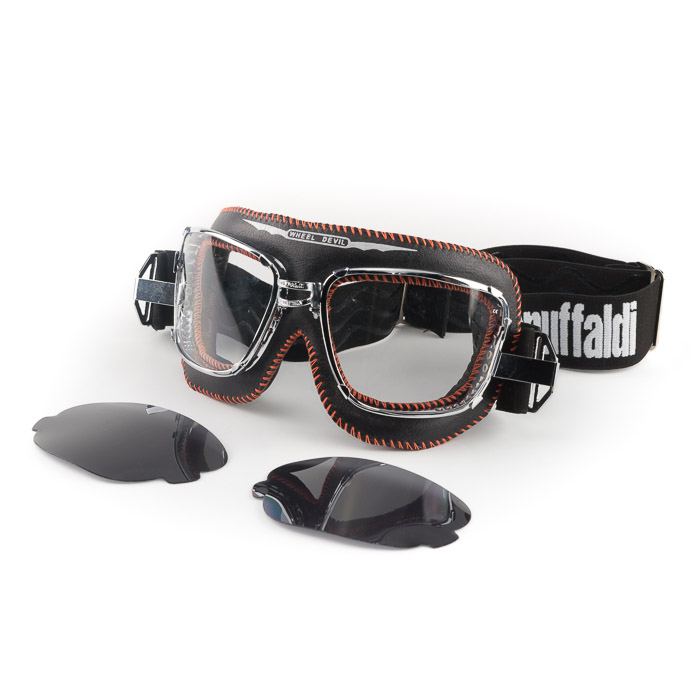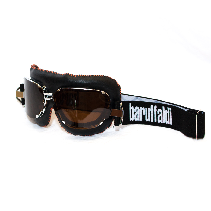 Maschera: interamente lavorata e cucita a mano in Italia. Cuscino in pelle di bue nera con impunture arancioni. La parte interna del cuscino è in pelle di agnello nera che a contatto con il viso risulta essere particolarmente morbida e confortevole. Il cuscino ha una morbida imbottitura e l’occhiale risulta essere molto leggero. La maschera è dotata di uno speciale gancio girevole studiato da Baruffaldi che ne permette l’adattabilità su tutti i tipi di caschi.