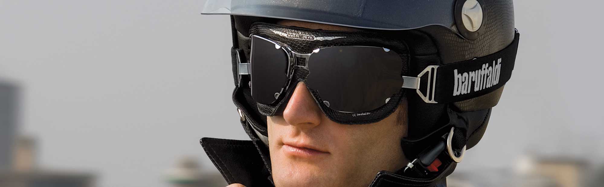 Lenti: l’occhiale è venduto con lenti in policarbonato antifog di colore neutro e sovralenti in acetato ottico di colore marrone. Le sovralenti colorate sono intercambiabili per uso diurno e notturno. La montatura delle lenti è dotata di uno speciale sistema di aerazione che non le fa appannare.