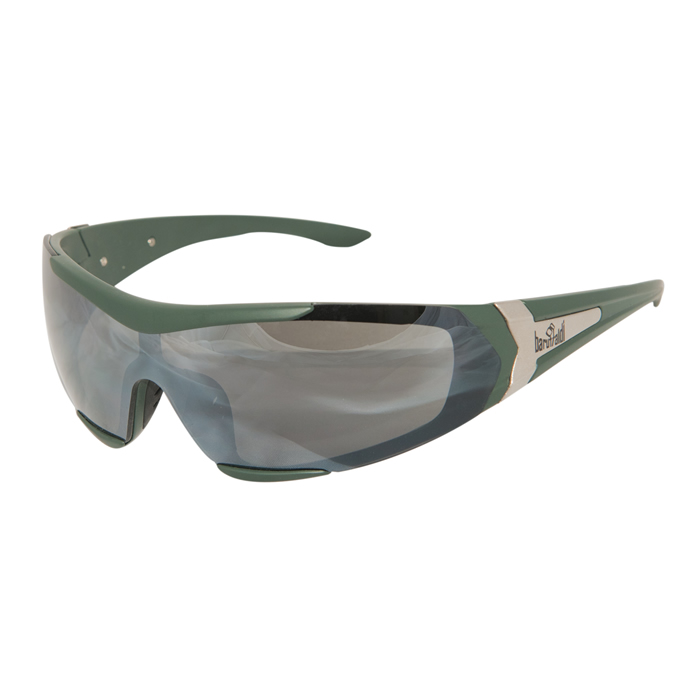Occhiale a maschera unica in policarbonato fumo specchiata ed intercambiabile dalla linea avvolgente, adatto ad essere indossato sotto casco.